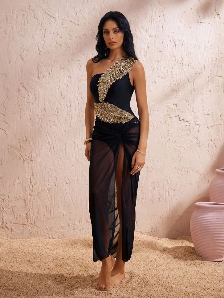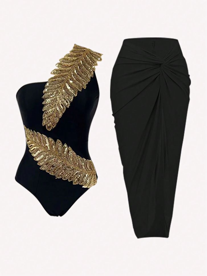 • Луксозен цял бански в черен цвят в комплект с парео